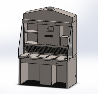 Service door and telescopic shelf designed to accommodate the formalin storage tank conveniently.